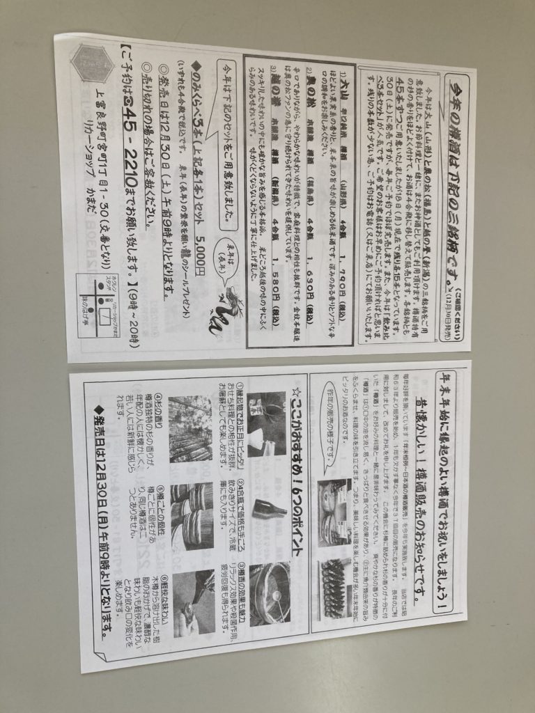 年末30日に販売する樽酒のご予約を受付中です。毎年ご利用くださるお得意様をはじめ、広く町民の方にも知っていただく事を主眼に新聞折り込みチラシも作成し19日に折り込みました。今日現在で3種類の在庫はそれぞれ15本ほど。『チラシを見たんですけど』とご注文をくださる電話も入りはじめています。ご予約はなるべくお早めにお願いしたいと思いますので