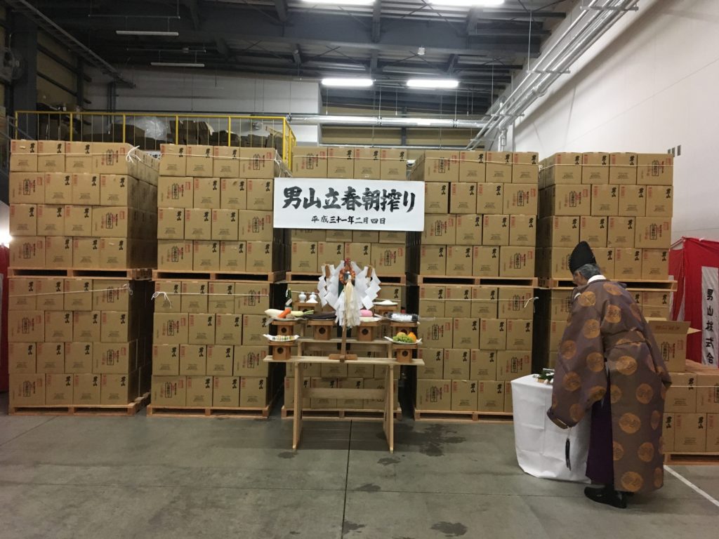 立春の未明に搾りあがったお酒を私たち酒屋が地元に持ち帰る前に、酒蔵近郊の神社(宮司)さんによってお祓いが行われます。 新しい年のあ酒にふさわしいように「無病息災」「家内安全」「大願成就」「疫病退散」などを祈願し、皆様に幸多かれとけがれのない新酒をお届けします。 今年は北は北海道から南は九州まで43の酒蔵で実施され(同時刻で)、この日だけで約34万本が出荷される予定です。正にギネス級の出荷本数なんですね。